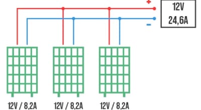 - Voltaje: El voltaje total es igual al de un solo panel, manteniéndose en 12 V si los paneles son de 12 V.